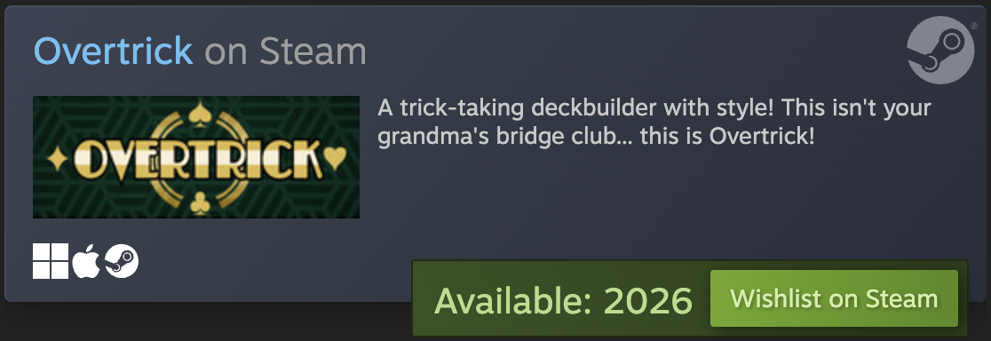 A trick-taking roguelike with style! Outplay your rivals, purchase special abilities, and dazzle 1920s high society with your unstoppable cardplay. Call your contract, follow suit, flush trumps, and claim the hand. This isn't your grandma's bridge club... this is Overtrick!